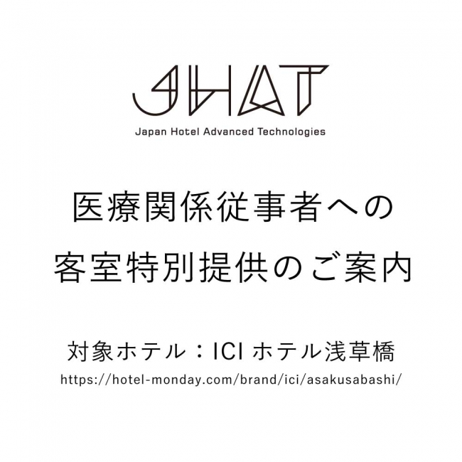hotel MONday、ICI HOTEL(浅草橋・上野新御徒町)、RELIEF PREMIUM(羽田空港)を運営する株式会社JHATは新型コロナウィルスと最前線で闘う医療関係従事者をサポートし、政府が懸念する医療崩壊を防ぐため近隣に医療施設が多くあるICI HOTEL 浅草橋 (JR総武線『浅草橋』駅より徒歩2分) の客室を特別に提供しております。