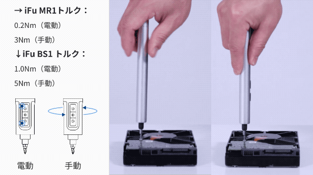 IFuの『MR1』『BS1』は時計/反時計回りが直観的に上下ボタンで操作出来ます。また、電動/手動の切り替えも瞬時に出来ます。より高いトルクが必要な時に、そのままボタンを離して、手動で回す事も可能です。余計なボタン操作も要らずに、ネジを強く締めたい時にとても便利です。