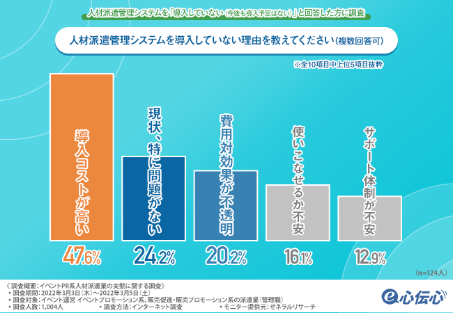 「人材派遣管理システムを導入していない理由を教えてください(複数回答可)」と質問したところ、『導入コストが高い(47.6%)』と回答した方が最も多く、次いで『現状、特に問題がない(24.2%)』『費用対効果が不透明(20.2%)』と続きました。