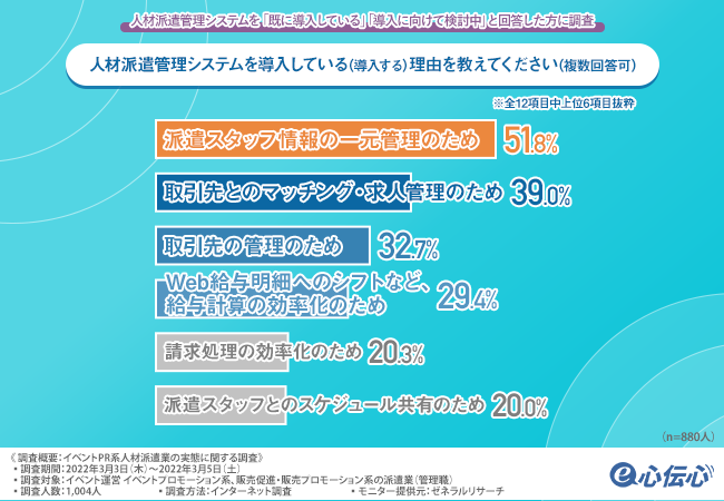 そこで今回、人材派遣システム『e心伝心』(https://e-densin.jp/)を運営するサイバーキューブ株式会社は、イベント運営・イベントプロモーション系や販売促進・販売プロモーション系の派遣業(管理職)の方を対象として「イベントPR系人材派遣業の実態に関する調査」を実施しました。