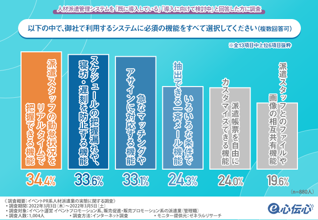 そこで、「以下の中で、御社で利用するシステムに必須の機能をすべて選択してください(複数回答可)」と質問したところ、『派遣スタッフの勤怠状況をリアルタイムで把握できる機能(34.4%)』と回答した方が最も多く、次いで『スケジュールの把握漏れや、寝坊・遅刻を防止する機能(33.6%)』『急なマッチングやアサインに対応する機能(33.1%)』『いろいろな条件で抽出できる一斉メール機能(24.3%)』と続きました。