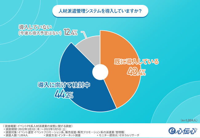 「人材派遣管理システムを導入していますか?」と質問したところ、『すでに導入している(43.4%)』と回答した方が最も多く、次いで『導入に向けて検討中(44.2%)』『導入していない(今後も導入予定はない)(12.4%)』と続きました。