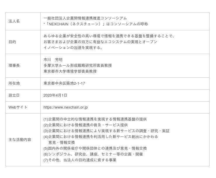 一般社団法人企業間情報連携推進コンソーシアムは、このたび、日本政府が掲げる新たな社会像であるSociety5.0の社会実装の加速に向け、業種・業界の垣根を越えて、個人・企業双方に有益な新たなサービスの創出のほか、実用化に向けたビジネスや技術面での課題の検討、環境・ルール整備などを活動の目的として、企業間の情報連携を推進するコンソーシアム「NEXCHAIN(ネクスチェーン)」を立ち上げ、本日より、本コンソーシアムの設立目的にご賛同いただける企業からの会員募集を開始いたします。