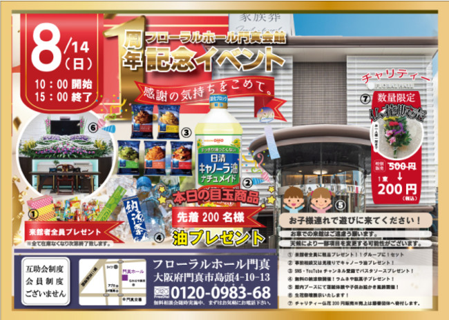 おかげさまで、家族葬専門会館ブランド「フローラルホール」の旗艦店となる「フローラルホール門真会館」は2021年7月31日にオープンしてから、1周年を迎えることができます。支えてくださるお客様のおかげで、こうして成長を続けられています。本当にありがとうございます。今回、日頃お世話になっている大切な地域の方へ感謝の気持ちを込めてプレミアムなイベントを開催いたします。申し込みや入場料は一切不要です。