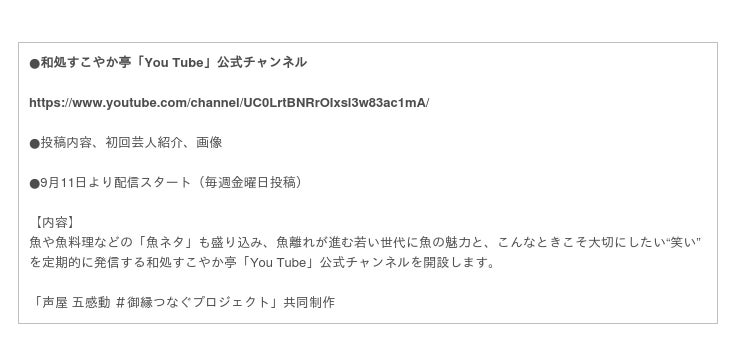 そこで、コンテンツ発信場所として、「和処すこやか亭」を提供、魚や魚料理などの「魚ネタ」も加えたネタで、魚離れが進む若い世代に魚の魅力と、こんなときこそ大切にしたい“笑い”を定期的に発信いたします。