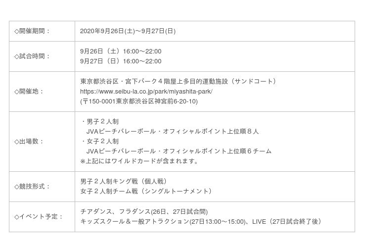 株式会社ウィンズ(WINDS)は、一般社団法人日本ビーチバレーボール連盟(JBV)と共催のもと「2020 BEACH VOLLEYBALL RAIZIN CUP」を、9月26日(土)・27日(日)に東京都渋谷区・宮下パークにて開催いたします。