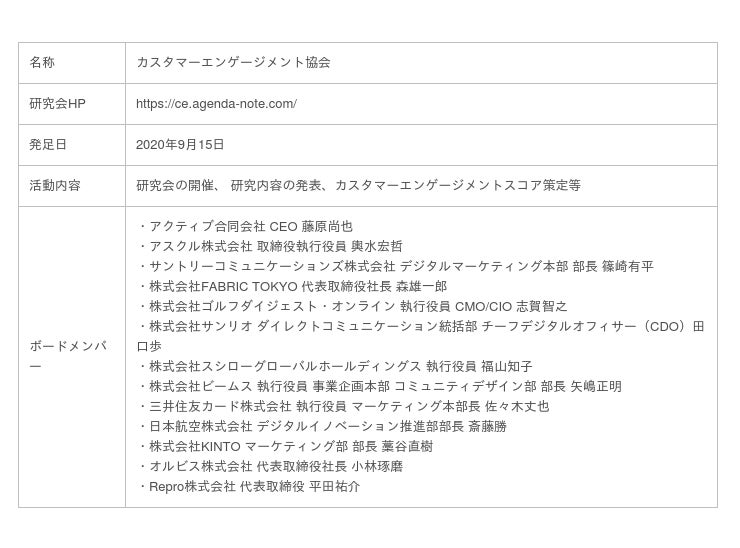 カスタマーエンゲージメントに関する情報発信や研究会主催のセミナーなどを予定しております。 情報をご希望の方は、研究会ホームページより会員登録をお願いいたします。(会員費無料) https://ce.agenda-note.com/