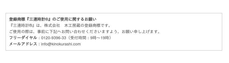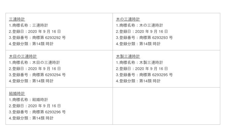 株式会社 木工房蔵(本社:福井県越前市、代表取締役:竹内良介 ブランド名:木の暮らし)は、2020年9月16日、自社商品の名称である「三連時計」「木の三連時計」「木目の三連時計」「木製三連時計」「結婚時計」の商標登録を取得いたしましたことをお知らせします。
