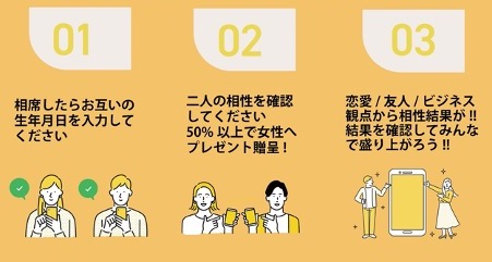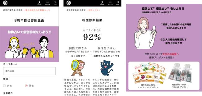 今回、生年月日を利用した動物キャラナビ診断によって、相席相手と相性診断をすることができます。相性が50%以上の場合、フェイスパックやバスソルトセットなどのノベルティをプレゼント致します。また、相席屋をご利用いただいたお客様は、退店後に弊社の個別の性格診断が受けられるようになっています。
