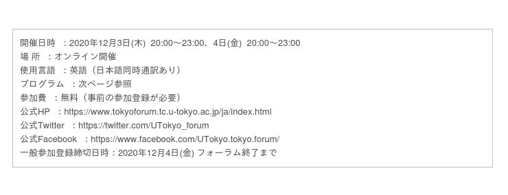 東京大学(本部:東京都文京区、総長:五神 真)は、韓国Chey Institute for Advanced Studiesと共催で、2020年12月3日(木)、4日(金)の2日間、「Tokyo Forum 2020 Online」を開催致します。