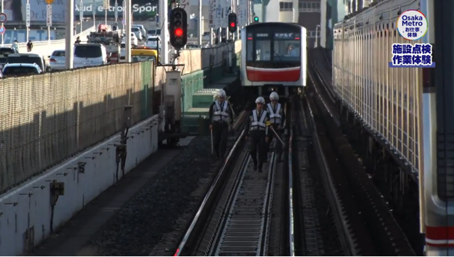 御堂筋線西中島南方駅~中津駅間のトンネル内および新淀川橋梁上で営業時間中の線路巡視の様子を保守作業員の視点での映像をご覧いただけます。列車接近時に待避した作業員のすぐ前を列車が通過していく様子は迫力と臨場感あふれる映像です。