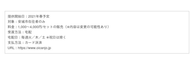 2021年春に安城市農畜産物特産品協議会(事務局:安城市農務課)、アイディアバルブ株式会社(愛知県安城市朝日町2-11 代表取締役:高津潤也 URL:https://i-bul.com)が共同で安城市在住者に特化した新型コロナウイルス感染症対策と地産地消を目的とした地元の農産物を販売するサイト『おいしいあんじょう(oic-anjo)』をオープン致します。