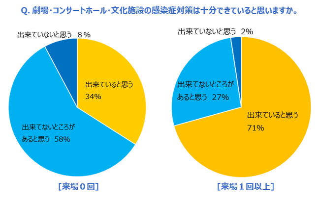 スタッフ対応においてのフリー回答では、「感染症対策をしていない鑑賞者にはしっかりと注意して欲しい」など、感染症対策の徹底を求める声が多く挙がりました。施設面においてのフリー回答でも、「確かな対策が実施されていること」を前提として、物品販売やサイン会などを求める声もありました。芸術文化施設には、サービス面・施設設備面両方から、「感染症対策のコントロール」が強く求められているようです。