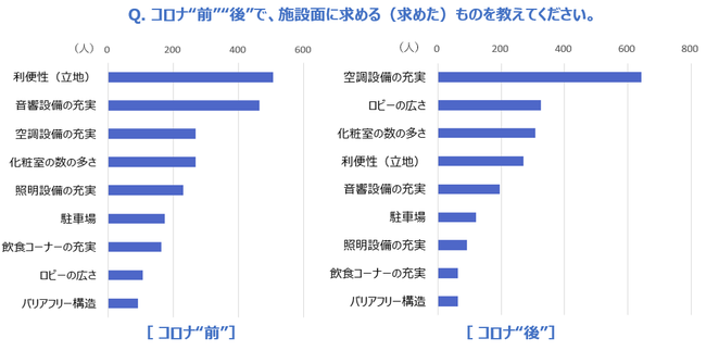 『化粧室の数の多さ』は、前後変わらず上位にランクインしています。しかし選択理由は、コロナ前は「利用時の快適さのため」から、コロナ後は「ソーシャルディスタンスが取れるため」が要因に変化したと見られ、一見変わらず求められているように見えるものにも、変化が内包されていました。現在、鑑賞者が施設面に求めるものは、「訪れやすさ・施設利用時の快適さ」から「安心安全性」に変容していると言えます。