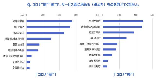 施設面だけではなく、サービス面に求める点もコロナ前後で大きく変化しました。施設面と同様にコロナ前後を比較すると、『感じの良さ』は2位→4位、『豊富な知識』は5位→7位とランクダウン。一方で『清潔感のある見た目』は4位→2位、『着装(持ち物や装備)』は8位→5位にランクアップしました。スタッフのマスク等の着用により、表情が読み取りにくいうえ、接触を避けるためにコミュニケーションが減少しており、また、感染リスクの不安から清潔感が重要視されている結果だと思われます。