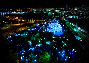 横浜・みなとみらいの新港地区にて開催している、都市型イルミネーション「ヨルノヨ-YOKOHAMA CROSS NIGHT ILLUMINATION-」は、横浜らしさを作り上げてきた「ひと・もの・文化の交差(CROSS)」を演出コンセプトに、横浜・みなとみらいの街全体を舞台として、光が場所と人を交差して織りなす、パノラマイルミネーションを展開しています。メイン会場の新港中央広場では、「NIGHT WALKING」を展開し、横浜らしさを作り上げてきた《人・もの・文化の交わり》の象徴である「クロスドーム」をはじめとした光と音の演出が、人々の動きに合わせて刻一刻と変化します。期間中毎日30分に1度訪れる「NIGHT VIEWING」では、新港中央広場や、周辺20施設の個性を活かした躍動する光と音の5分間の演出を行います。横浜都心臨海部10箇所に設置する、夜の横浜をつなぐ光のオブジェ「PORTAL(ポータル)」をくぐり抜けながら横浜の街を巡ったり、プロジェクター付き自転車で、アート作品等の映像を壁に投影しながら、街を歩いて巡る回遊プログラム「ヨルノヨ×SAMPO_MAPP(サンポマップ)」など、参加者が光をつくる体験をお楽しみいただけます。