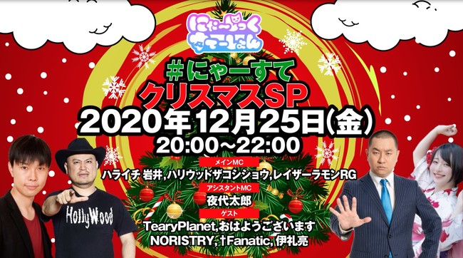 「#にゃーすてクリスマスSP」は、にゃ~じっくすてーしょん注目のアーティストが出演する1日限定のオンラインライブイベントです。Teary Planet、おはようございます、NORISTRY、†Fanatic、伊礼亮ら5組が生ライブを披露。そして、いつものハチャメチャMC陣も集結しクリスマスの聖なる夜を彩ります。なお、この番組はStreaming+にて12月27日(日)までお楽しみいただけます。