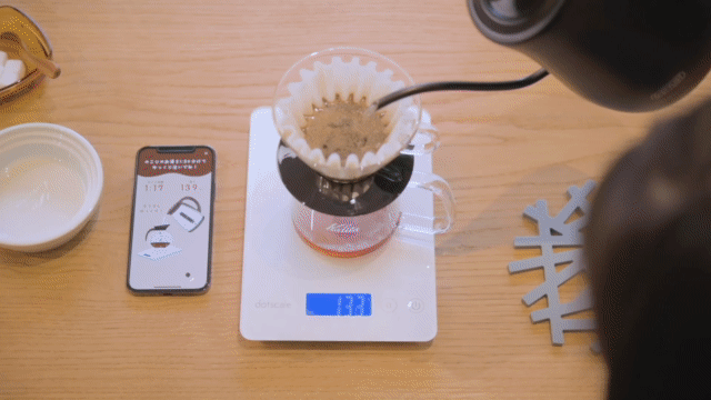 dotscale の上にドリッパーをセットし、スマホの手順にそってコーヒーをいれることで、注がれたお湯の量と時間から出来上がりの「美味しさ点数」を判定します。