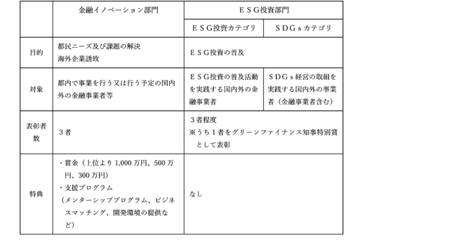 東京金融賞は、都民のニーズや課題の解決に資する画期的な金融商品・サービスの開発・提供を行う金融事業者等に加え、ESG投資※の普及活動を実践する金融事業者等を表彰することを通じ、都民の皆さまの利便性向上と金融活性化の実現を目指すものです。