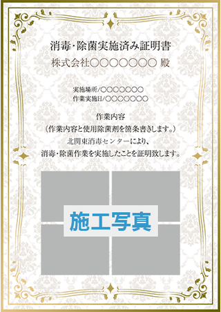 感染者や濃厚接触者が出ても、しっかり消毒作業した証明書を掲示する事により、安心して事業・営業再開が可能となります。