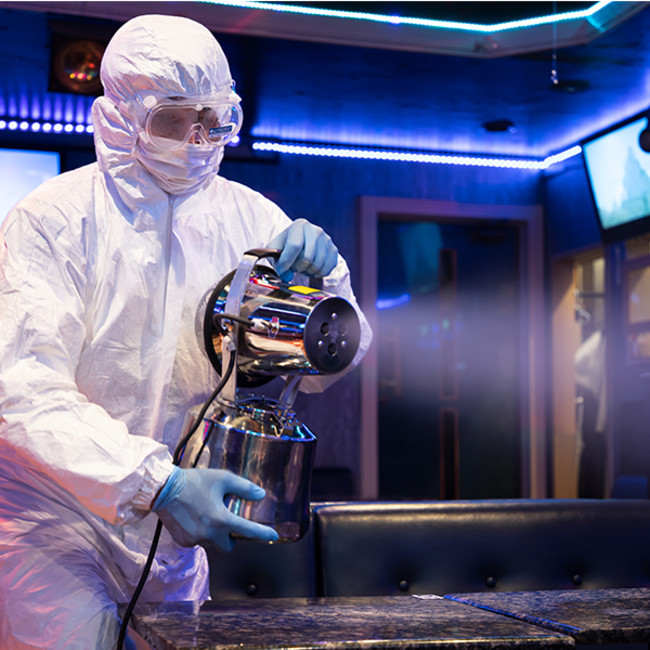 手の届かない箇所や噴霧できない精密機器類、金属類も強力紫外線殺菌灯照射により、消毒いたします。