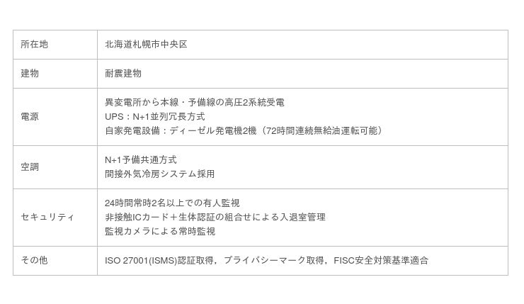 道内外企業や自治体の情報システムをお預かりする商用データセンターとして2001年に開業。電力事業で培ってきたノウハウを生かし、高信頼のファシリティと万全のセキュリティをお客さまにご提供しています。自然災害リスクの極めて低い札幌市の都心3キロ圏内に位置し、北海道内企業のみならず全国のDR(ディザスタリカバリ)サイトとしても活用いただいています。