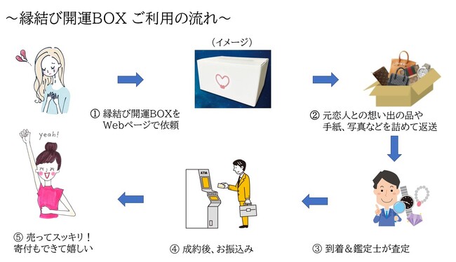 私たちは、元恋人からもらった想い出のブランド品をリユースして、新たな出会いへの軍資金に変えてスッキリできる「縁結び開運BOX」サービスを提供いたします。