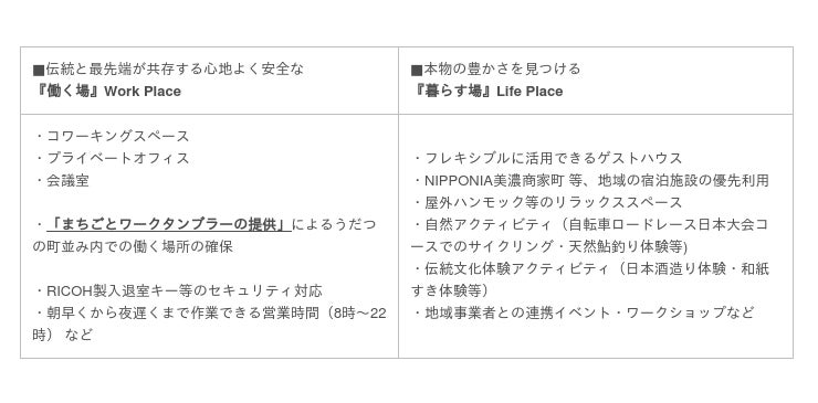 わたしたちは働き方改革やリモートワークに取り組まれる東海圏・都市圏の企業の方や、豊かな暮らしと働き方の両立を目指される個人の方と、これからの社会に必要な働き方を追求していきたいと強く願っております。また、本事業を通じて美濃市に意思をもって継続的に関わる交流人口が増える事により、地域のシビックプライドの醸成・価値のある景観の維持・保全、町の活性と豊かさの増進に繋げる事にも取り組んで参ります。