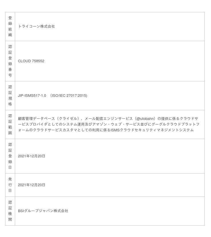 株式会社セプテーニ・データ・ソリューションズ(本社:東京都新宿区、代表取締役: 武藤 政之)の連結子会社であるトライコーン株式会社(本社:東京都新宿区、代表取締役:福原 雄亮、以下「トライコーン」)の提供するCRM プラットフォーム『クライゼル』メール配信エンジンサービス『@utobahn(アウトバーン)』が、ISO/IEC 27017:2015に基づくISMSクラウドセキュリティの国際規格認証「ISO 27017」を取得いたしましたことをお知らせします。