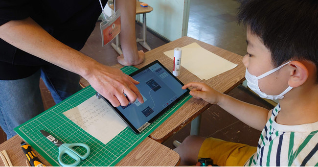 発想したアイデアを、あらかじめ用意しておいた工作素材を用いてカタチにしていきます。さらに、イベントを共催したVIVIWARE株式会社のメンバーの方々にサポートいただきながら、VIVIWARE Cellを組み込み、タブレット端末から「音を鳴らす」「移動させる」などの動きを設定していきました。