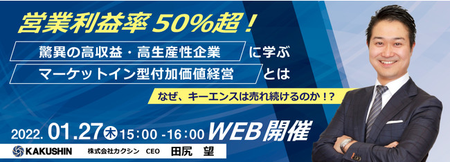 経営コンサルティング・人財育成の仕組み構築を行う株式会社カクシン(本社:大阪府大阪市、代表取締役:田尻望)は、営業利益率を継続して向上する仕組みを学べるウェビナー「なぜ、キーエンスは売れ続けるのか!?~圧倒的な成果を再現し続ける構造とは何か?~」を2022年1月27日(木)に開催致します。