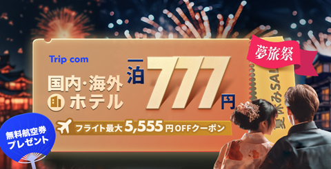 グローバルオンライン旅行サービスプロバイダー、Trip.comは2023年7月4日(火)から7月7日(金)までの4日間限定で「夢旅祭 夏休みSALE」を開催いたします。国内や「韓国、タイ、ベトナム、台湾、香港」など対象の海外ホテル・フライト・チケットを夏休みSALE限定価格で販売!1泊777円で泊まれる宿泊プランや、最大5,555円OFFの格安航空券&ホテルクーポン、さらに海外行き無料航空券や国内ホテル無料宿泊券の抽選など夏休みSALE限定のスペシャルオファーが盛りだくさん!