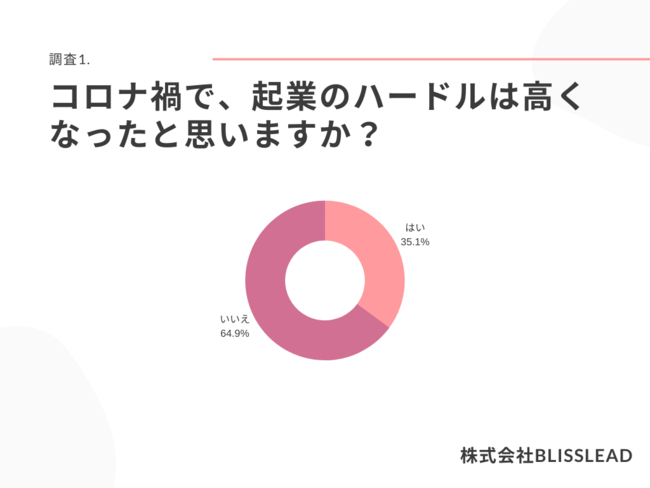 起業家志望者328名を対象に、コロナ禍における起業環境の印象に関する調査を行ったところ、「起業に対するハードルは変わっていない」と感じる方が64.9%、「起業に対するハードルが上がった」と感じている方が35.1%と、起業環境に変化を感じる方が少ないことがわかりました。