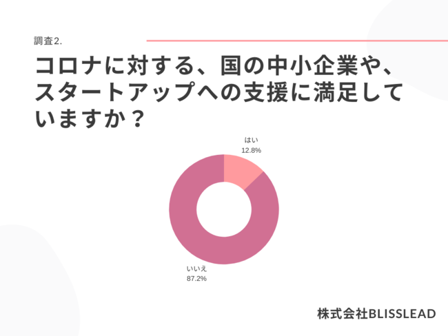 政府の、中小企業やスタートアップへのコロナウイルス対策に対する満足度調査では、「政府の支援に満足していない」と答えた方が87.2%、「政府の支援に満足している」と答えた方が12.8%と、政府の中小企業やスタートアップに対する支援に満足していない方が、満足している方を大きく上回る結果となりました。