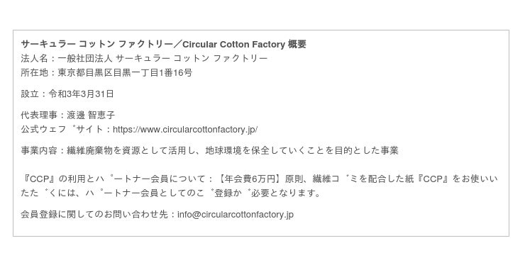 繊維ゴミを資源として活用することを目的とした活動を行う、一般社団法人 サーキュラー コットン ファクトリー /Circular Cotton Factory (本拠地:東京都目黒区、代表理事:渡邊智恵子、以下「CCF」)は、2021年9月9日(木)、日本で初めて繊維ゴミの配合率50%以上の紙(サーキュラー コットン ペーパー/Circular Cotton Paper 以下「CCP」)を開発・事業化したことをお知らせいたします。 同日に行われました、公益社団法人日本外国特派員協会での記者発表会では、日本郵政株式会社 取締役兼代表執行役社長 増田寬也氏、ミナ ペルホネン デザイナー/創設者の皆川明氏らが登壇いたしました。