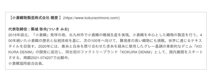 小倉織物製造株式会社(福岡県北九州市、代表取締役:築城弥央)は、小倉織の高密度等の特長を活かし、高い技術を用いて革新的なデニム「KOKURA DENIM」を開発。まずは、デニムの本場アメリカでの展開をはかり、『JAPANブランド育成支援事業(特別枠)』に参画、本年アメリカで先行デビューを果たしました。そして、この度、アメリカでのテストマーケティングを経て、「KOKURA DENIM」を同社のファクトリーブランドとして国内展開していくことになりましたのでご案内申し上げます。