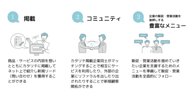 カタリテ掲載企業同士がマッチングすることで相互にサービスを利用したり、外部の企業にリファラルを出したり出されたりすることで新規顧客開拓ができる