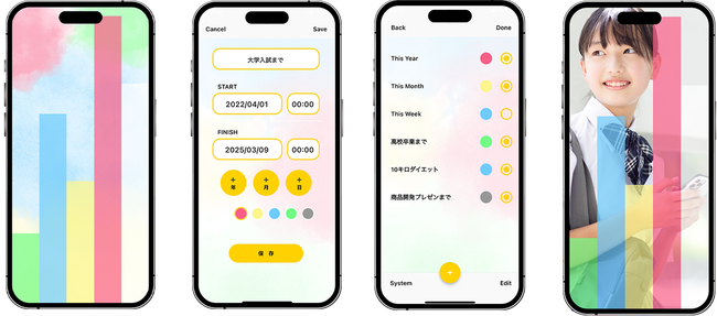『MIERUE』は、ユーザーそれぞれの時間軸における始まりと終わりの時間を設定いただくことで、残り時間を「タイムスケール」という新しい時の見方で表示します。(図2)例えば受験までの残り期間や、仕事でのプロジェクトの締め切り、我が子が成人になるまでの期間などを設定すれば、ユーザーにとって意味のある時がタイムスケールで分かりやすく表示されます。従来のアナログ時計やデジタル時計とは異なり、それぞれのユーザーに対してパーソナライズされた時間を表示でき、また「タイムスケール」によって時が失われていくことを視覚的に実感しやすい設計となっているため、ユーザーそれぞれの時の価値がもっと見やすくなります。『MIERUE』は新しい時の見え方を提供することで、ユーザー一人ひとりが、より満足度の高い時を過ごし、それぞれが掲げる目標を達成しやすくなるようサポートします。