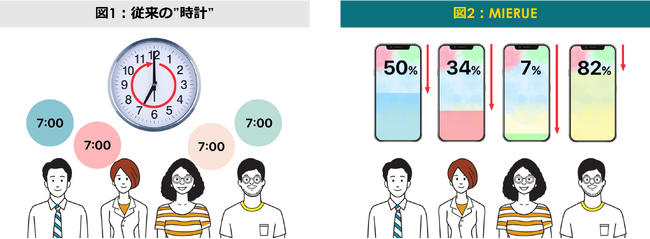 情報やコンテンツがあふれる令和時代において「タイパ」という言葉がトレンドとなり浸透する中、時の大切さを意識している人は年々増加しています。一方MIERUE Lab.では、本来は失ったら二度と戻ってこないという時の本質的特徴を日常的に感じながら生活している人はまだ多くないと考え、またその原因は時の見方にあるのではないかと考えています。私たちが普段目にしているアナログ時計やデジタル時計では、時間が共通の尺で示されているため、私たち自身の時間軸を意識しづらく、また、時が周期で示されているため、時が失われる実感も得づらいことが問題です。(図1)