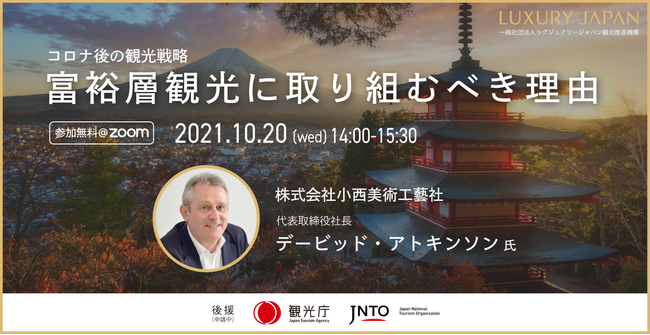 富裕層トラベルマーケット専門のB to Bプラットフォームの開発を手掛けている一般社団法人ラグジュアリージャパン観光推進機構(代表理事:宮山直之)は、観光業に携わる自治体・DMO・事業関係者向けの無料ウェビナー「富裕層観光戦略ウェビナー」を10月20日(水)14:00-15:30にzoomにて開催いたします。