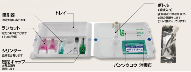 キットの構成:採血キット、検査申込書、返信用封筒など