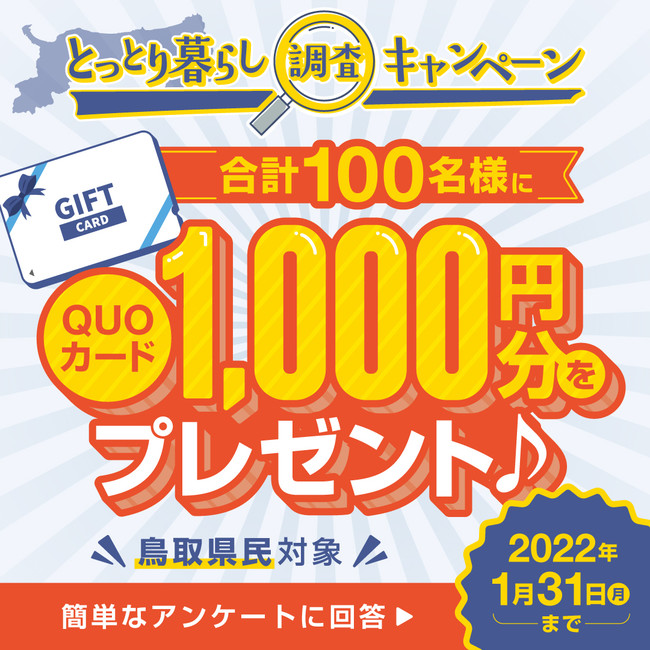 株式会社とっとりずむ(本社:鳥取県鳥取市、代表取締役:酒本勇太)は、抽選で100名様にQUOカードが当たる「とっとり暮らし調査キャンペーン」を2021年12月26日(日)~2022年1月31日(月)の期間、開催します。