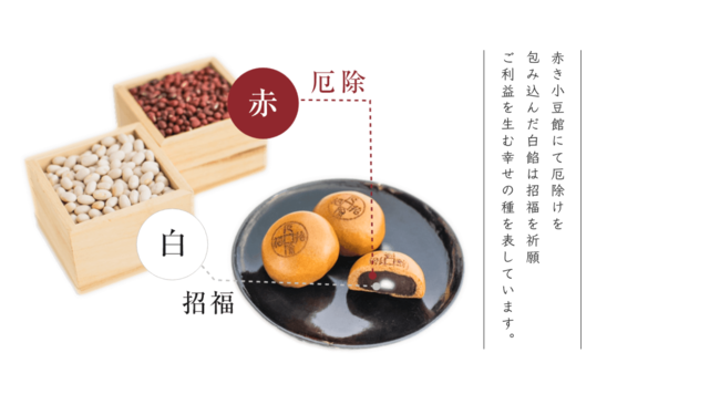 2.包み込んだ白餡は招福を祈願この紅白でのご利益を生む幸せの種を表しています。