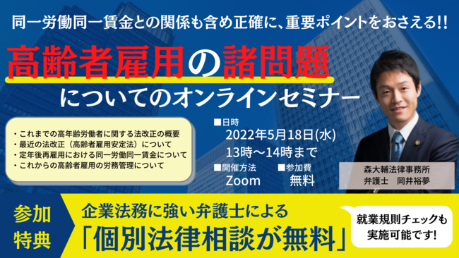 人事・労務、景品表示法、債権回収、契約書作成、知的財産、クレーム対応など、多数の企業法務案件を扱ってきた森大輔法律事務所の、弁護士岡井裕夢が『高齢者雇用の諸問題について』を無料・ウェビナーで、2022年5月18日(水)13時~14時に開催いたします。ご参加特典として、60分間法律相談(就業規則のチェックを含む)を無料でお受けいたします。
