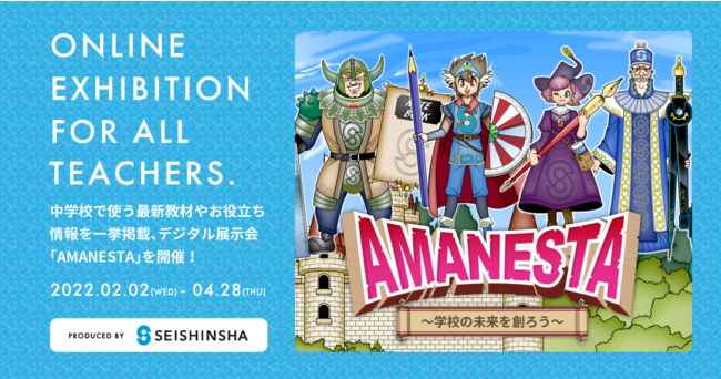 株式会社 正進社(本社:東京都文京区、代表取締役:小林伸二)は、中学校の教職員と教員を目指す大学生に向けたオンライン展示会「AMANESTA(アマネスタ)」を(株)図書文化社、山崎教育システム(株)、学事出版(株)、(株)mpi松香フォニックス、TOKYO GLOBAL GATEWAY、(株)シンプルエデュケーションと7社(団体)合同で2022年2月2日(水)から開催致します。