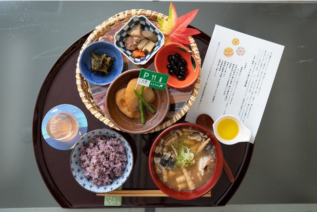 信州の郷土料理「サバと姫竹の味噌汁」をメインに、副菜のさつまあげは、横浜の練物有名店「能登屋」のものを使用。ご飯は国産の「黒豆ともち麦」で、不足しがちな食物繊維を補います。