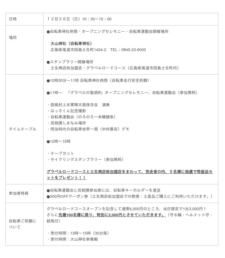 広島県尾道市因島にてグラベルロードコースオープンを記念して「自転車神社祭」・「グラベルの聖地(R)開所式」・「サイクリングスタンプラリー」を開催します!