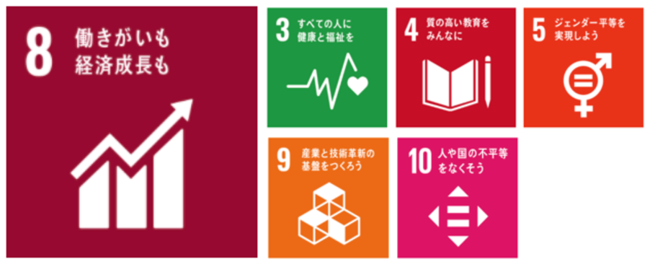・SDG'sでは、8番を中心に、3、4、5、9、10、16に貢献する