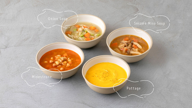 ゴロゴロ野菜の満足ミネストローネと大豆ミートとたっぷり野菜のごま味噌スープはプラントベースのスープです。