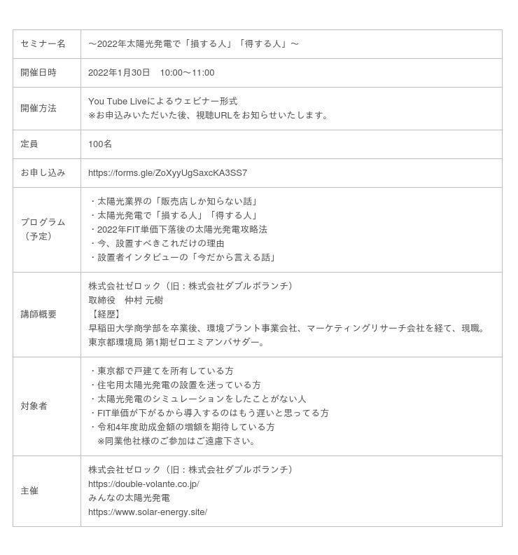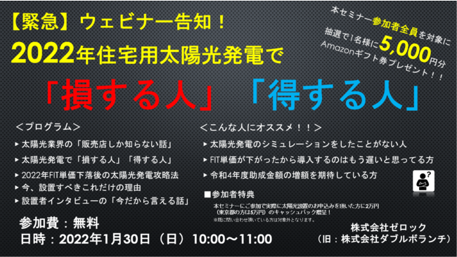 この度、脱炭素事業を手掛ける株式会社ゼロック(旧社名:株式会社ダブルボランチ、本社:東京都港区、代表取締役社長:松井大輔)は、住宅用太陽光発電システムの2022年設置検討者向けに無料ウェビナーを開催いたします。